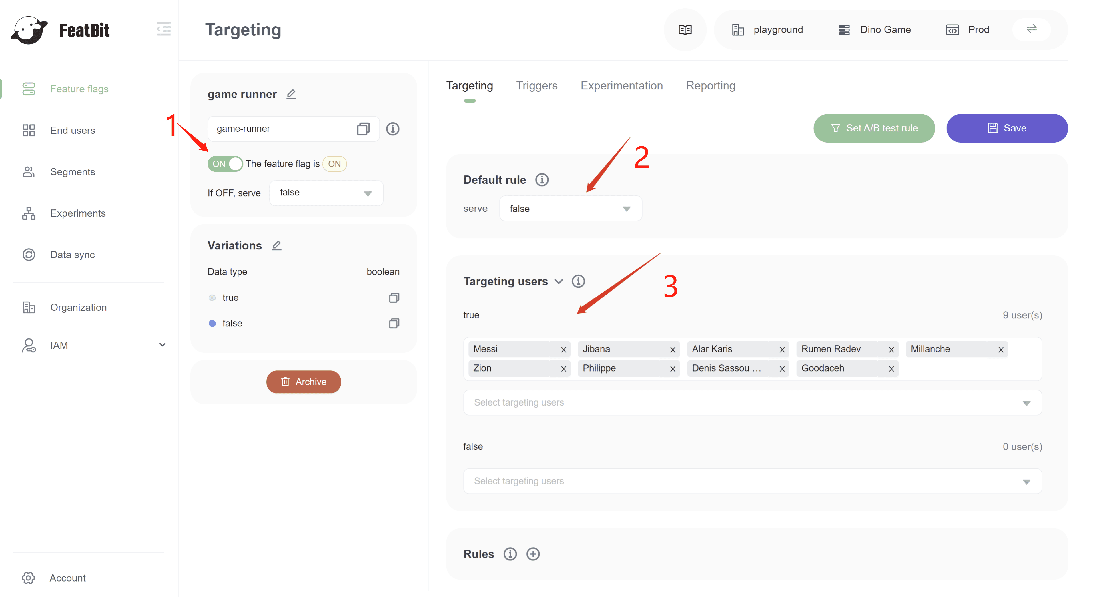 Go to the targeting page of your "game runner" feature flag, expand the section "Targeting Users". You will see two selection-list for each variation true and false.