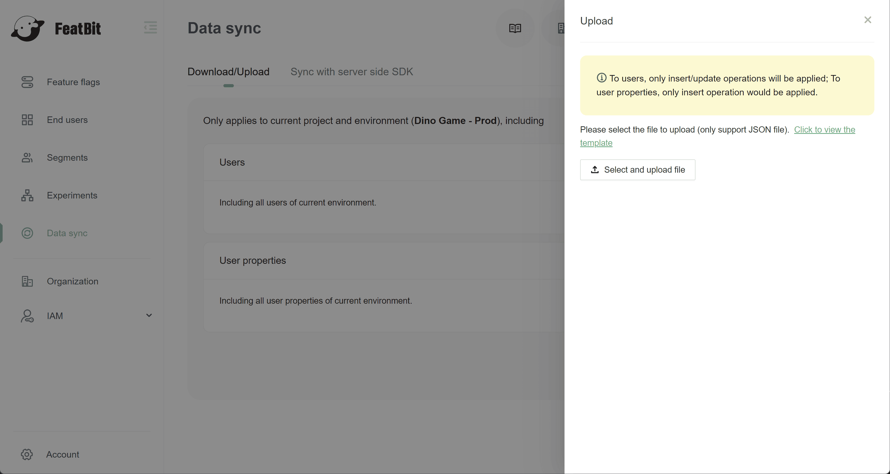 1. In "Data sync" section, you can import all users to FeatBit through a predefined JSON file.
