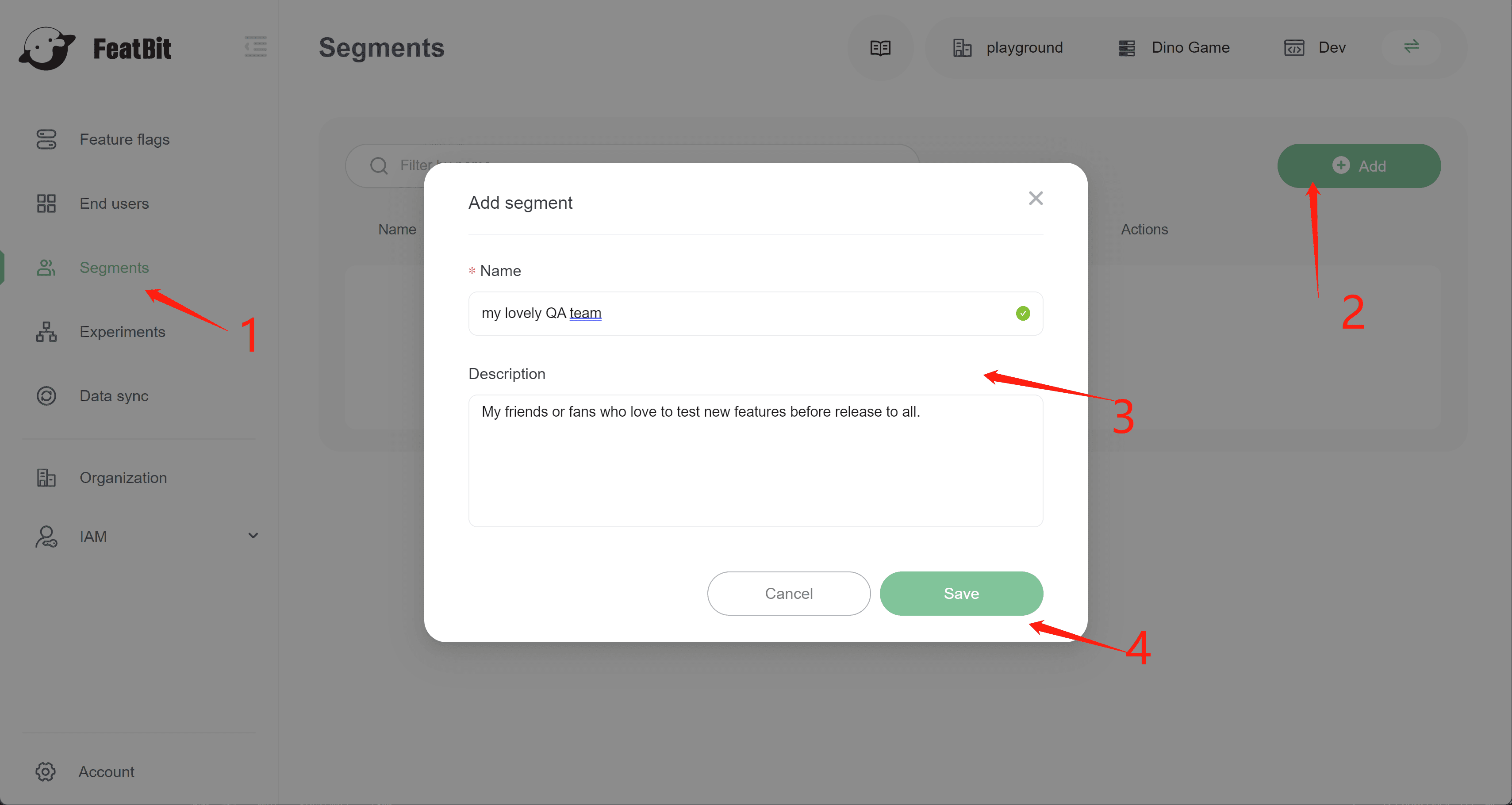 Go to page "Segments", create a segment with name "my lovely QA team".