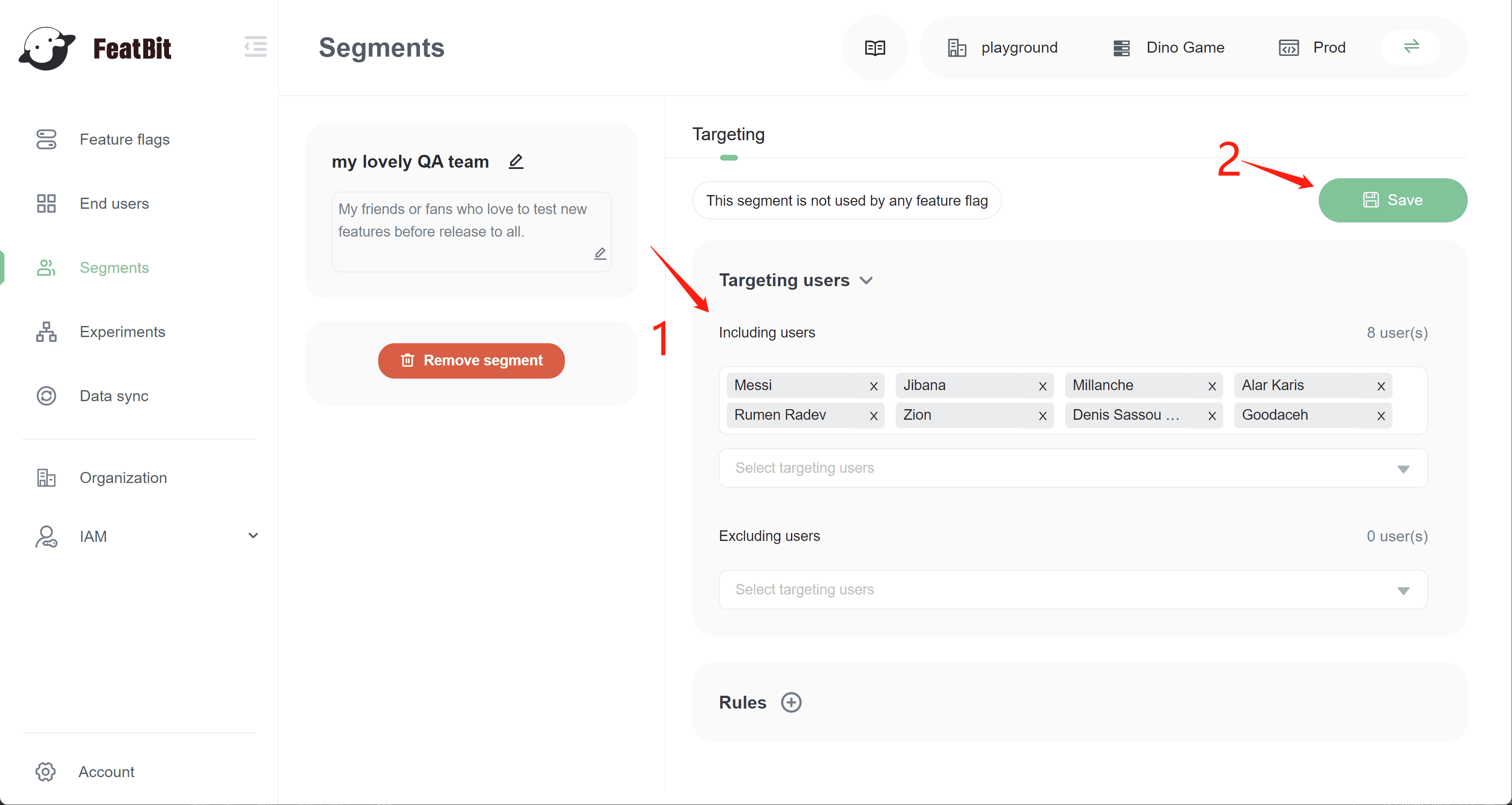 In the segment detail page, we add my lovely test users into "Including users" list, then we click save. This segment can be shared cross different feature flags.