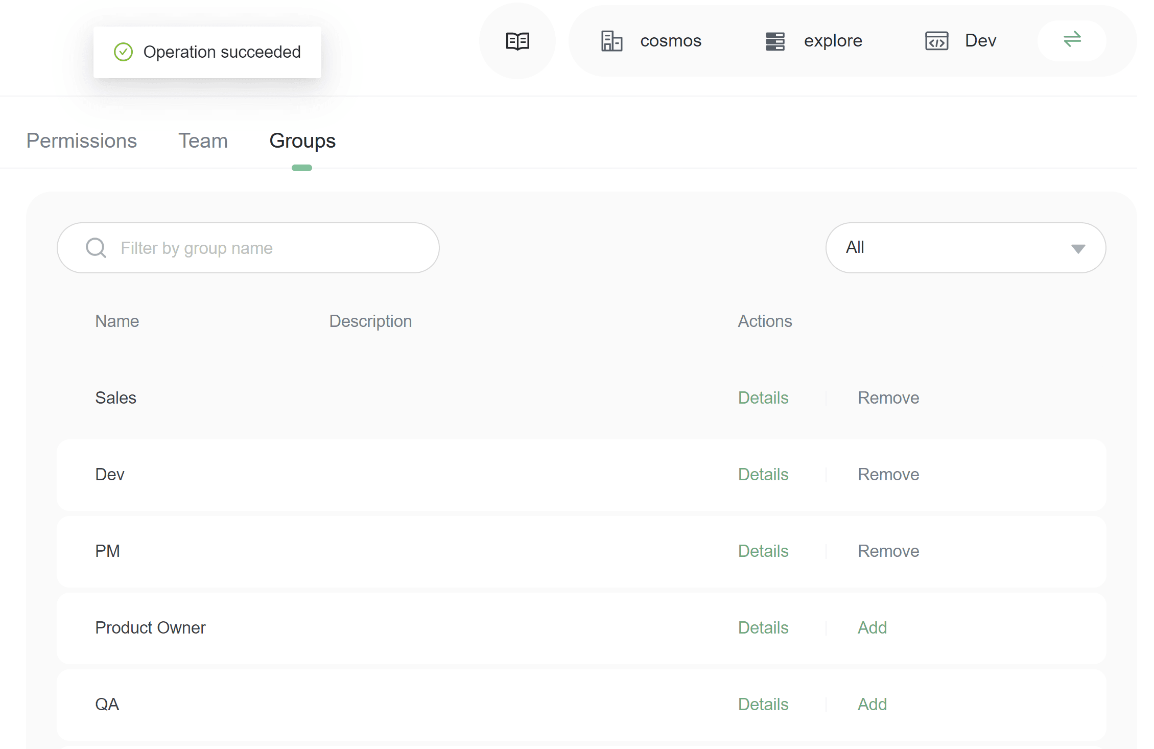 • In resource selector, we choose project/explore:env/Dev. It means the product environment we want to assign access to belongs to project explore. You can choose multiple resources, here we choose only one.